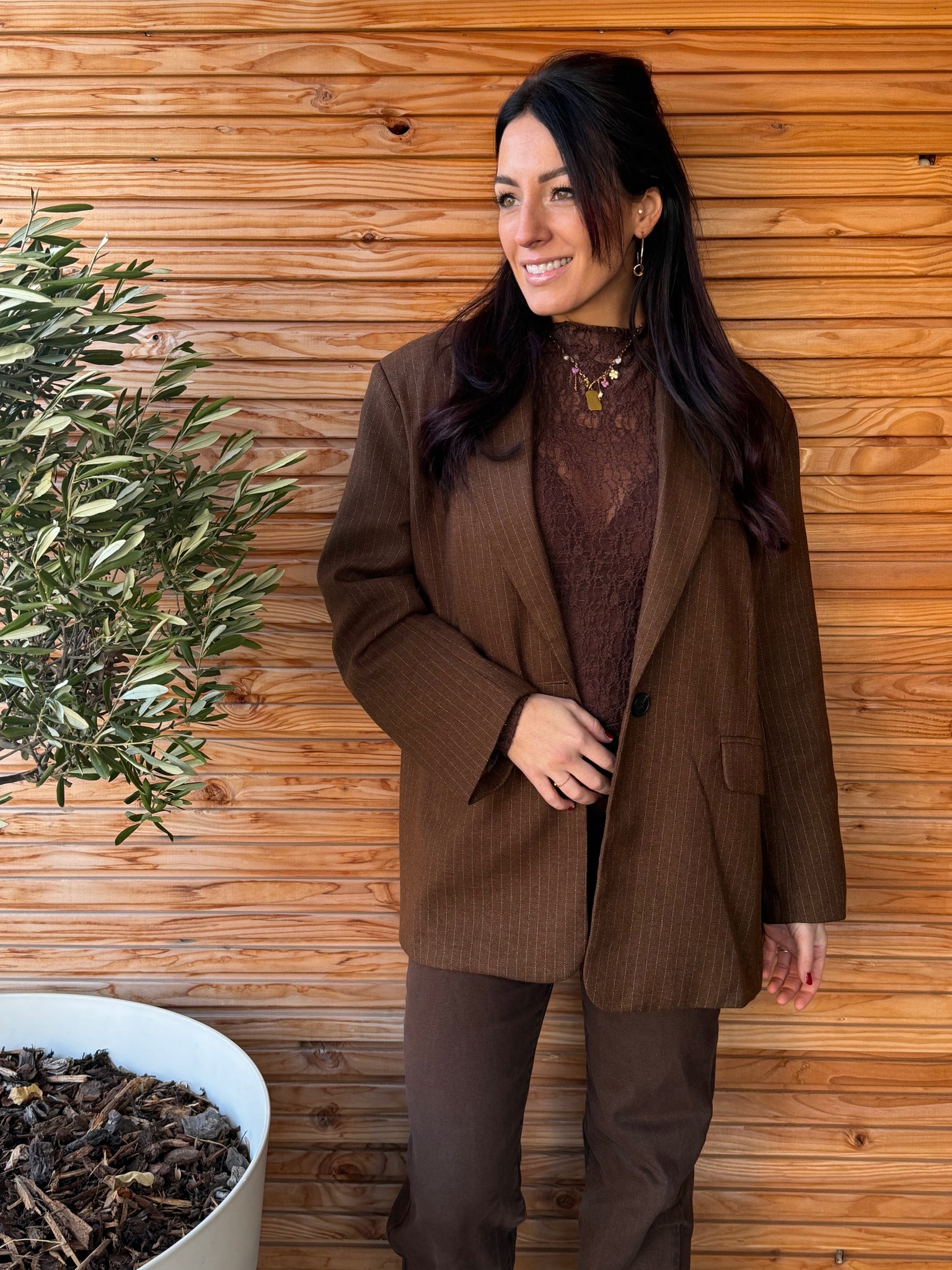 Breng je herfstlook naar een hoger niveau met onze Stripe Blazer in warme bruine tinten. Met zijn subtiele strepen en tijdloze pasvorm is deze blazer perfect voor zowel een casual dagje op kantoor als een stijlvolle avond uit.