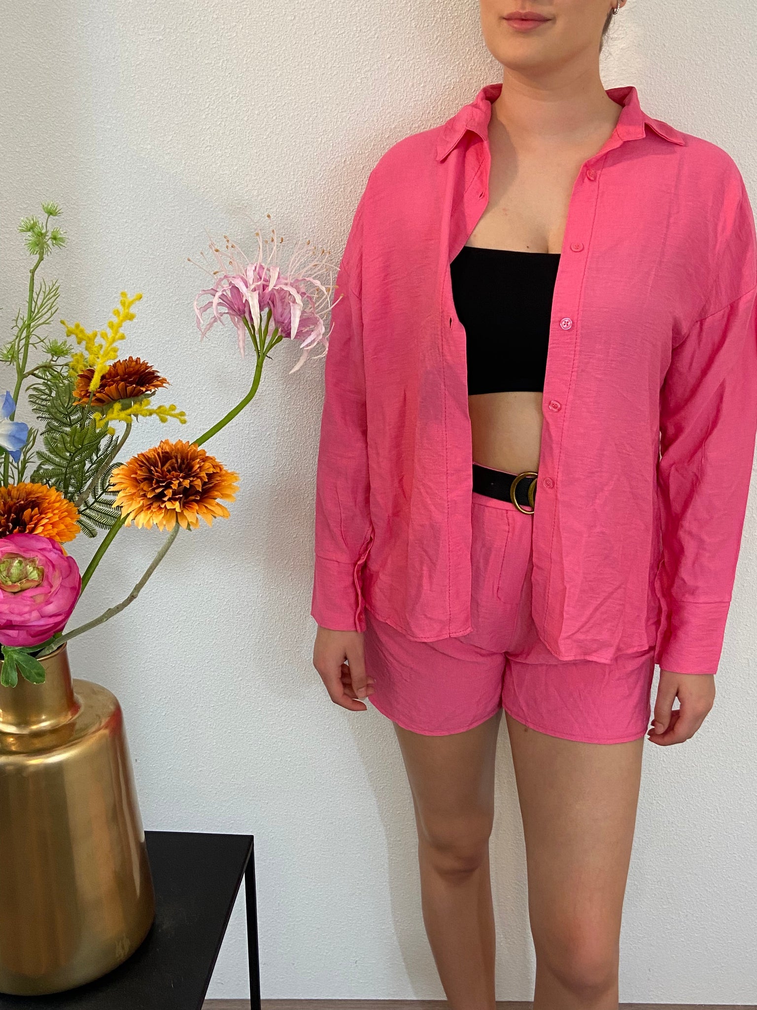 Deze geweldige set is in 5 zomerse kleurtjes verkrijgbaar! Wij zijn verliefd op deze stijlvolle overhemdset met bijpassende short, voorzien van een riempje. Gemaakt van viscose met een linnen achtige uitstraling, perfect voor de lente en zomer.